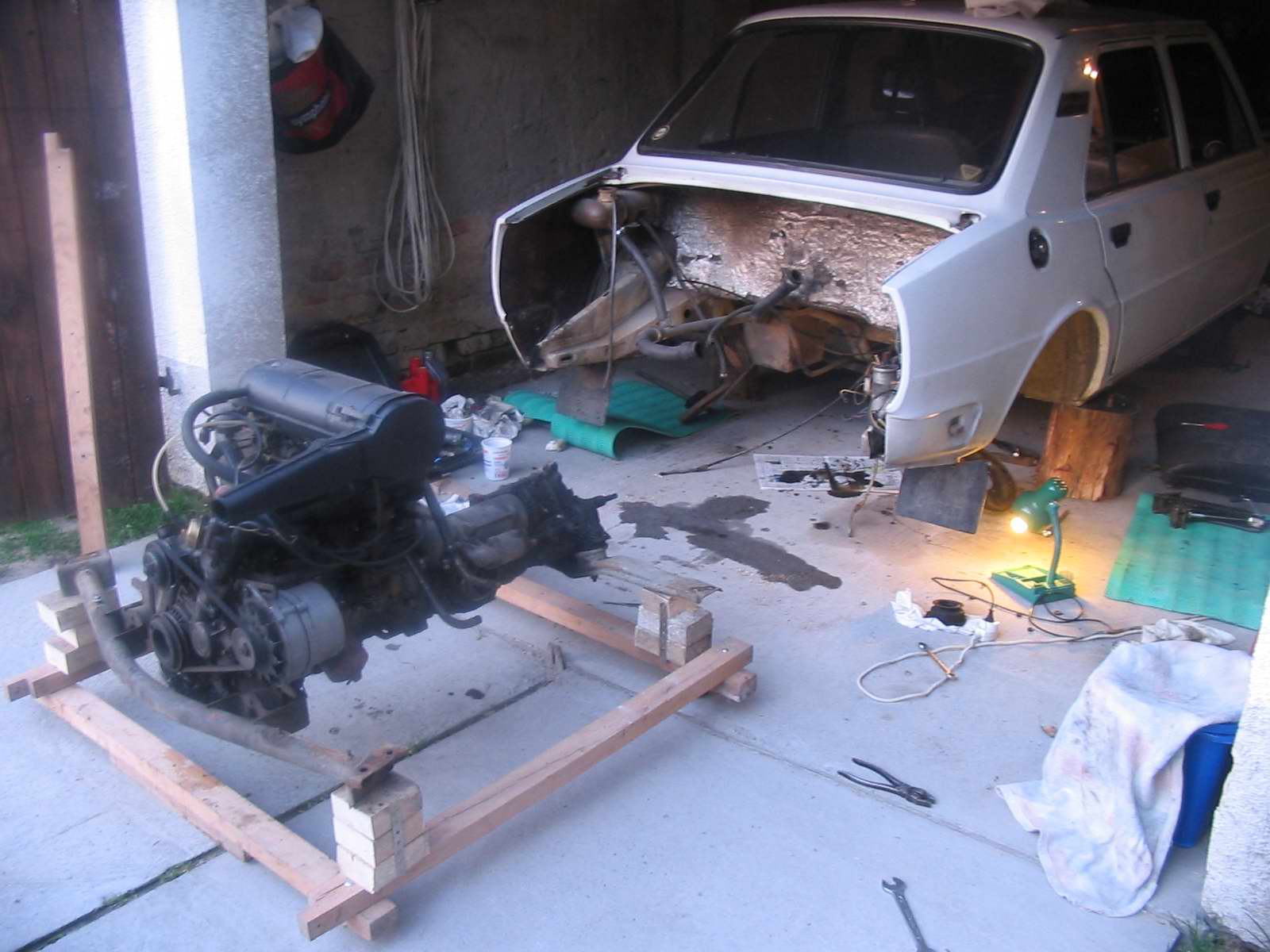 Az egészet célszerű olyan helyen csinálni, ahol van akna és hegesztőgép, alakítani kell a hátsó ülések alatt keresztbemenő merevítőn, mivel a tankon kívül ez is útban lesz a váltó hosszabb fedelének. Akna fölé gurulás után, a hátsó részt a megfelelő pontokon alá kell bakolni, aztán a szokásos előkészületek után legegyszerűbb az egész hajtást (motor-váltó-futómű) egyben kihúzni alóla. Ehhez én csináltam fából egy négyzet alakú kerekes keretet, a kereszttartók végpontjaira (kb a négyzet sarkaira) pedig tuskókat csavaroztam, a csavarok kitekerése után ráengedve különösebb fáradtság nélkül kijött az egész (rugókat és lengéscsillapítókat ki kellett bányászni, mert azok elakadtak volna). Ezt persze mindenki izlése szerint, ahogy meg tudja valósítani. Ezután jöhetnek a lényegi lépések: